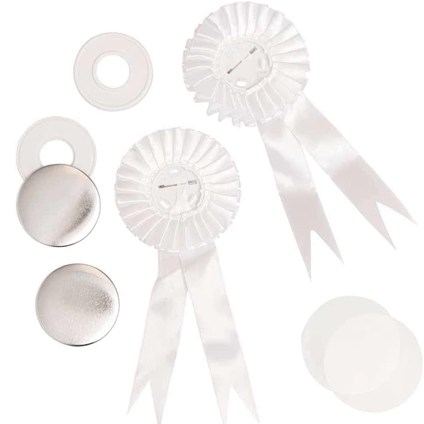 Las rosetas las componen 4 piezas y trae un enganche en la parte trasera. Miden 8 cm de diámetro con dos tiras de 12 cm de largo. Traen una tela fruncida de raso blanco con la parte central de plástico duro.