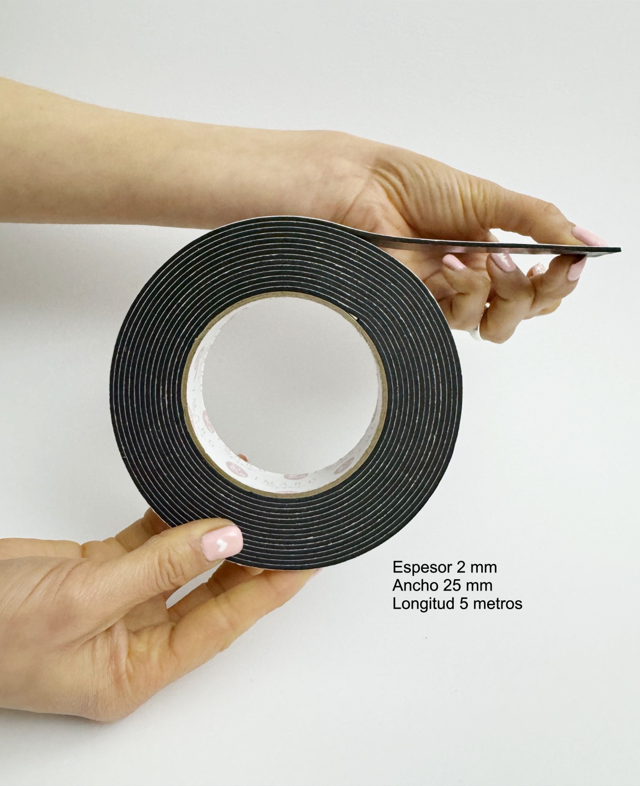 La cinta doble contacto de COLOR NEGRO es de 25mm de ancho, 2 mm de espesor y tiene una longitud de 5 metros