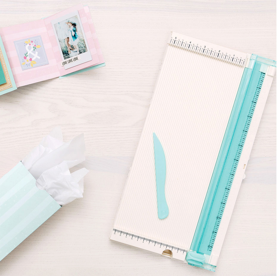 Esta cizalla de We R Memory Keepers ha sido especialmente diseñada para que puedas tener en una sola herramienta cizalla y tabla de hendido. Además, al ser plegable, ocupa muy poco espacio, por lo que es perfecta para llevársela a crops y talleres.